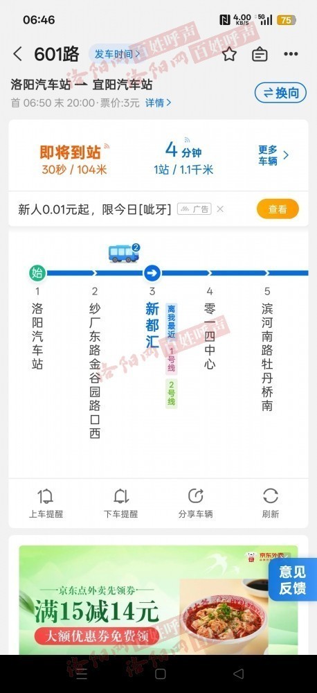 目前从宜阳到洛阳站第一班发车就不准时 会晚几分钟 路上耽误时间极长 及其影响顾客上班 图片为证 导致甚至出现第二班601车好几次比第一班公交车还快 多名乘客抱怨不停。有照片为证,甚至第二班601就和第一班公交车并驾齐驱 。对公交资源极大浪费同时也对乘客出行上班带来极大不便。 第一班公交大家愿意等就是好多在宜阳上班 需要打卡 甚至需要转乘其他车辆 如此做法 确实不妥 如果不解决 我将继续反映 知道车辆运营生态环境得到维护