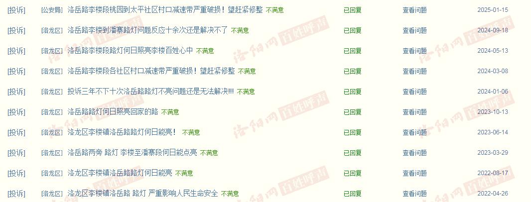 洛龙区三川大道和洛岳路路口是车流量很大的路口,李楼镇主干道洛岳路,李楼村往东到潘寨村路段路灯一直无法得到解决,反应十几次都是同样的回答,5年多时间里交通事故频繁,黑灯瞎火的,三两天一次人车事故,百姓安全问题严重,反应这么多次还是同意的话语,没有确切的时间点?这路车流量巨大,路灯不亮老出事故,赶紧修修洛岳路路灯李楼村到潘寨村吧!!!车流量大段!抓紧时间吧!安全无小事啊!最近看到新回复 ,说明已经进步不少了