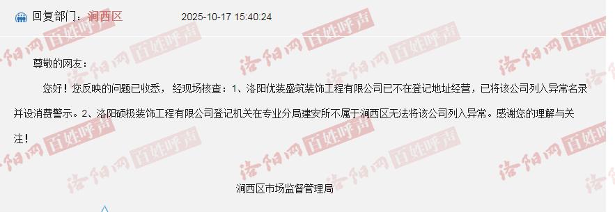 领导好,[洛阳硕极装饰工程有限公司]、【洛阳优装盛筑装饰工程有限公司】存在违法违规行为: