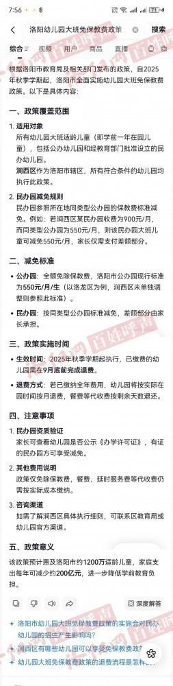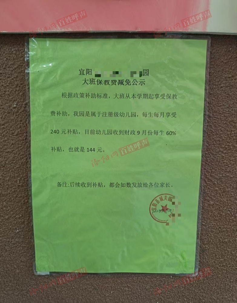 我是宜阳县某幼儿园大班学生的一名家长,根据国办发[2025]27号文件,国务院办公厅关于逐步推行免费学前教育的意见的规定,从2025年秋季学期起,免除公办幼儿园学前一年在园儿童保育教育费。对在教育部门批准设立的民办幼儿园就读的适龄儿童,参照当地同类型公办幼儿园免除水平,相应减免保育教育费。