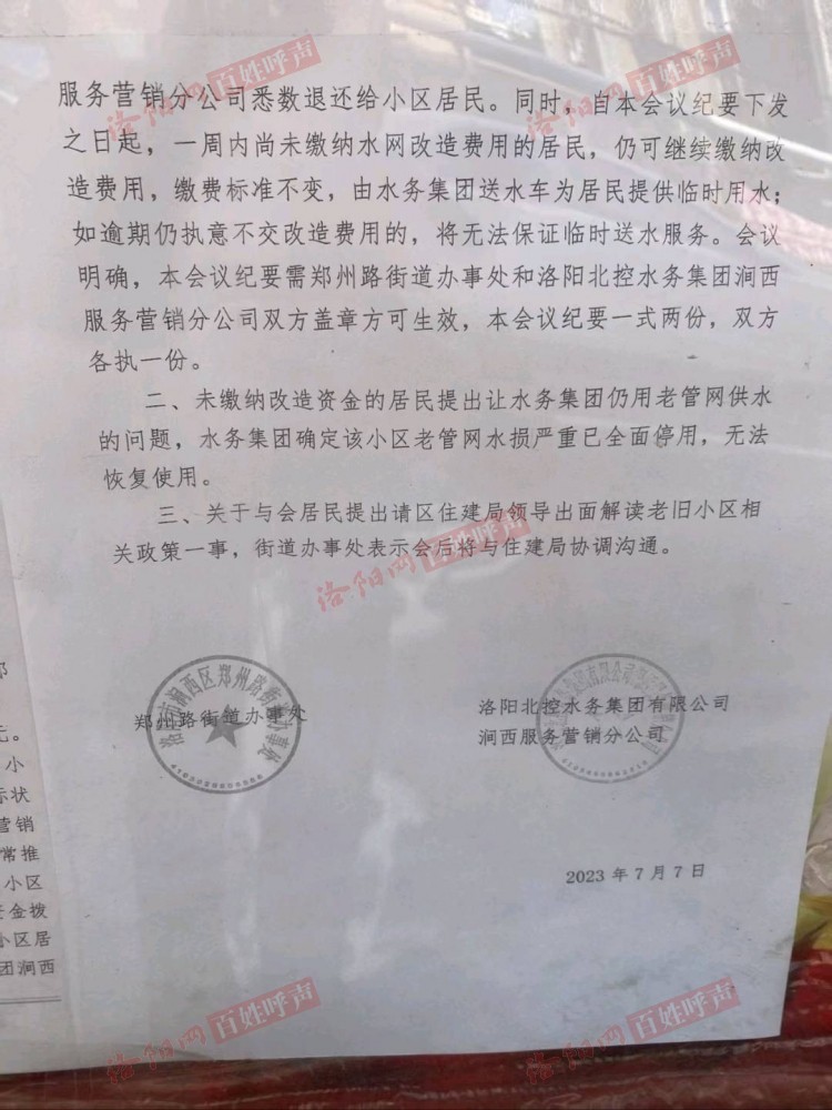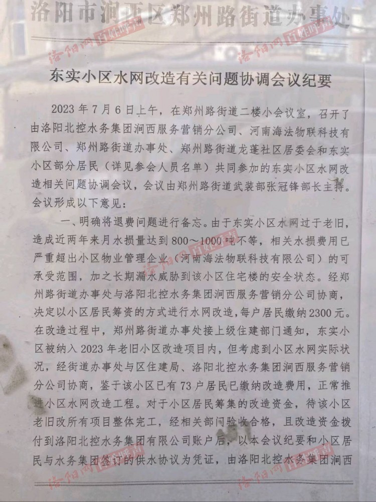 2023年涧西区东实小区因老水路老化导致漏水,同年小区被列为老旧小区改造范围,经社区,水务公司多方协调后,业主先行垫付改造费用,进行水路管网改造,并承诺改造结束款项到账后对业主退费,至此拒不兑现。
