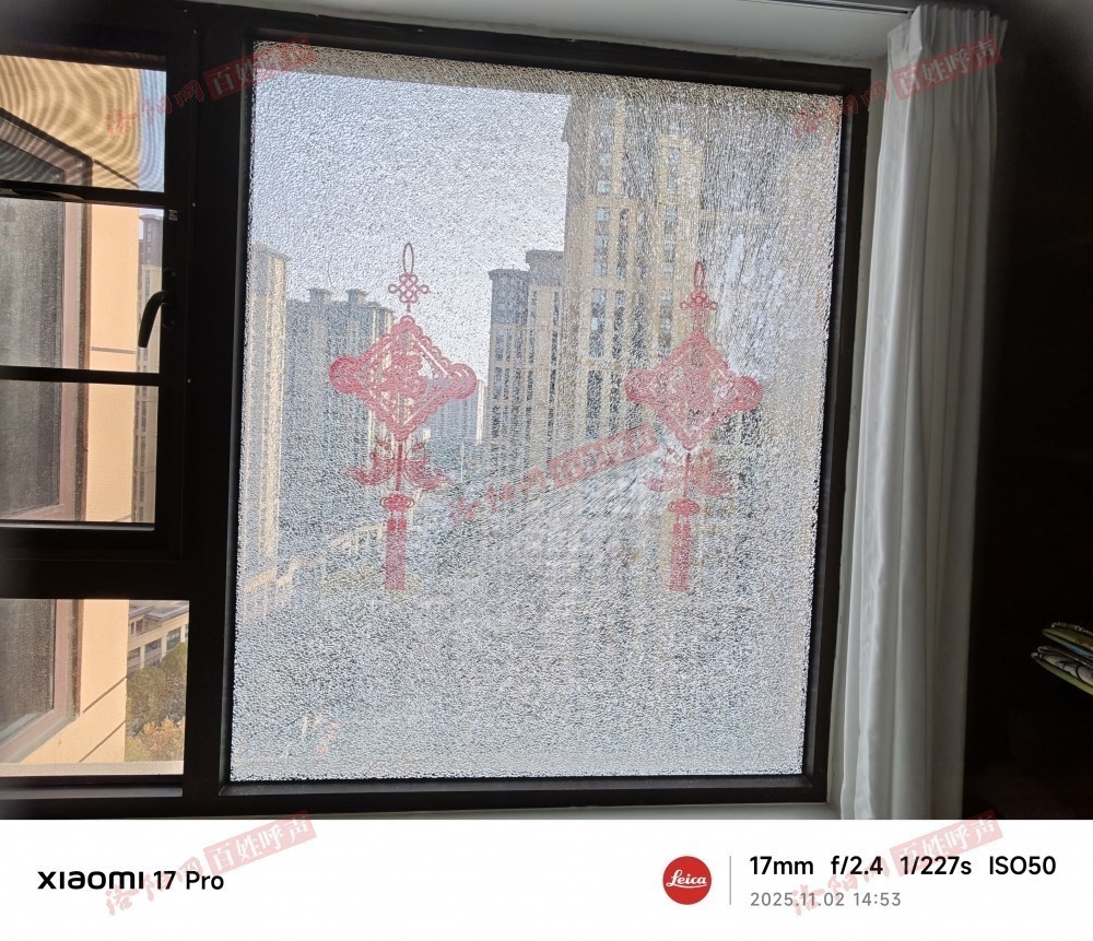 畔山兰溪四期,23年9月份交的房,主卧有1个月都没有人住,家里半个月没有人在。昨天回去发现主卧玻璃炸裂,碎玻璃渣在飘窗上。当时幸好房间没有人。给物业反馈,物业说工程部以2年质保期到不予理会并且诬陷说是我们业主自己弄炸的,今天枣行跟进物业,物业人员也是说我自己弄炸的。这件事严重威胁到了我和家人的生命安全。物业和开发商不作为,无视业主合理诉求。
